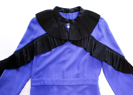 Western '80s Royal Blue Dress with Pleated Black Trim & Pearl Accent