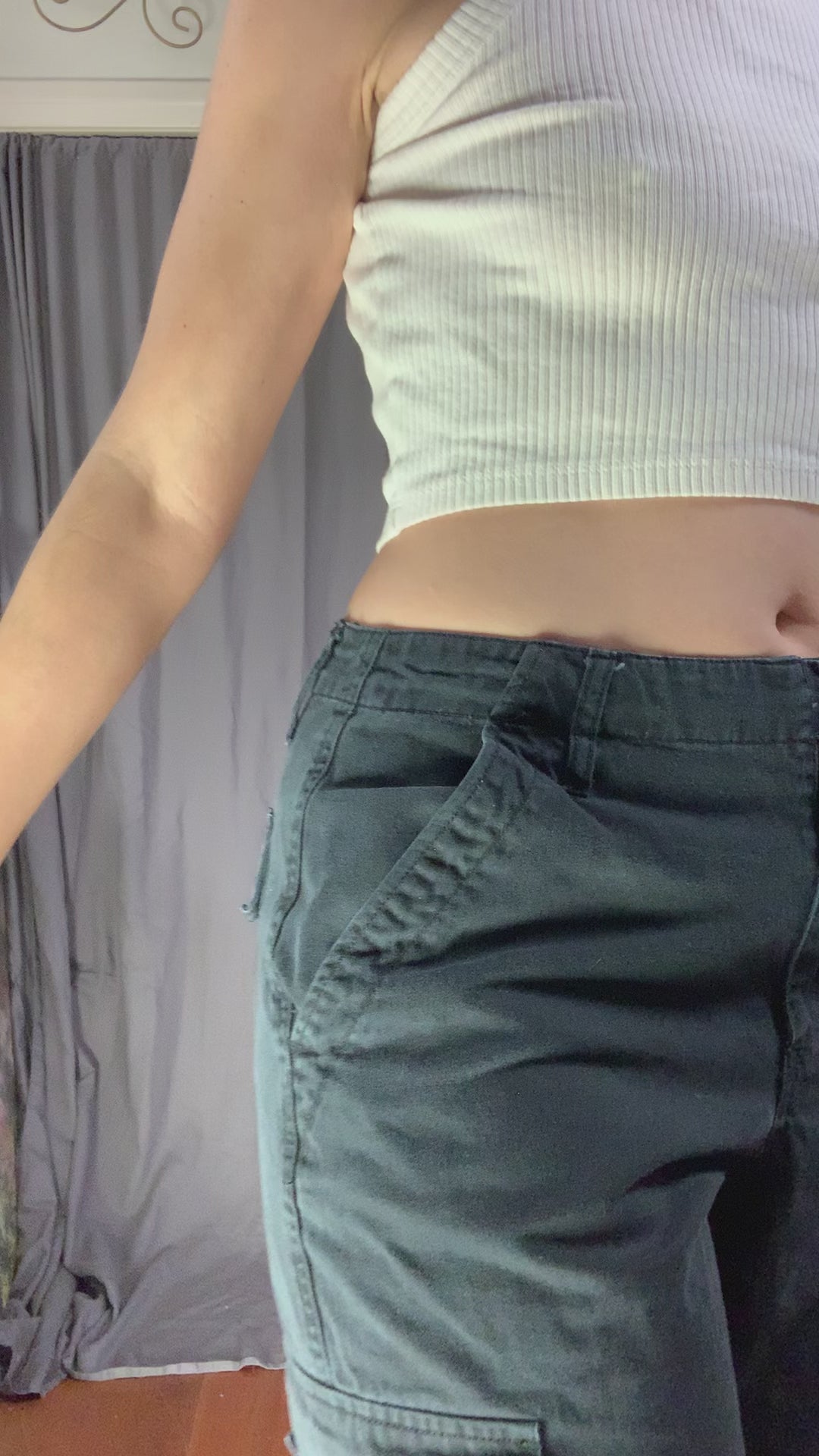 Classic Dickies workwear cargo pants for girls. Great detailing on these, I love the way the front slash pocket continues upward into the waistband, and the knees have pleats for comfort. Velcro flap side & back patch pockets. Hook & bar closure with zipper fly. Wide belt loops. These pants are a little rough around the edges, and their closure is a bit loose, but aren’t we too, especially after melting steel all day? Some fraying near the closure & at the hems, and a bit spotty but barely noticeable. Still plenty of life (and work) in these, just don’t buy if you expect them to be perfect (neither are you). Priced accordingly!
