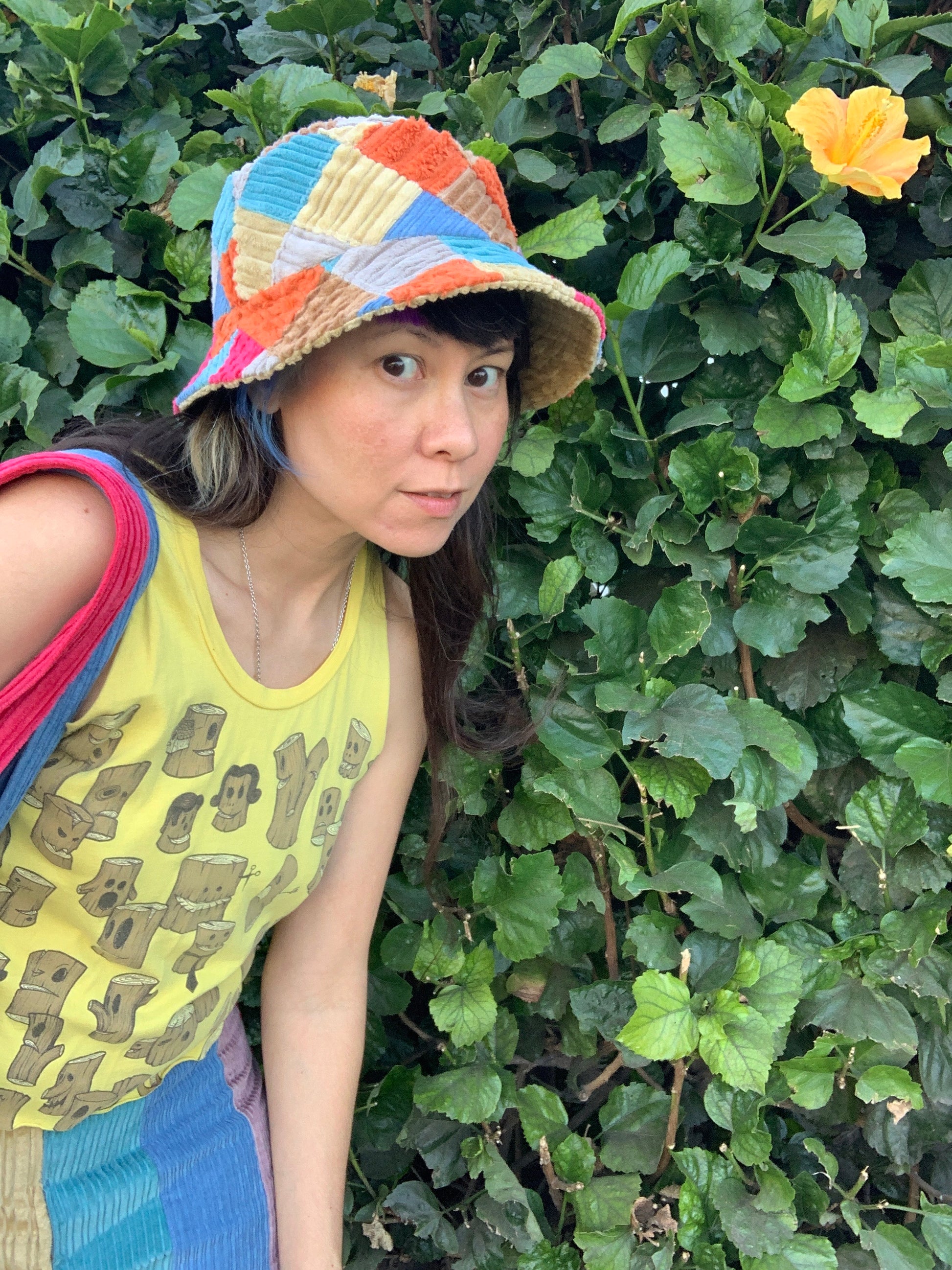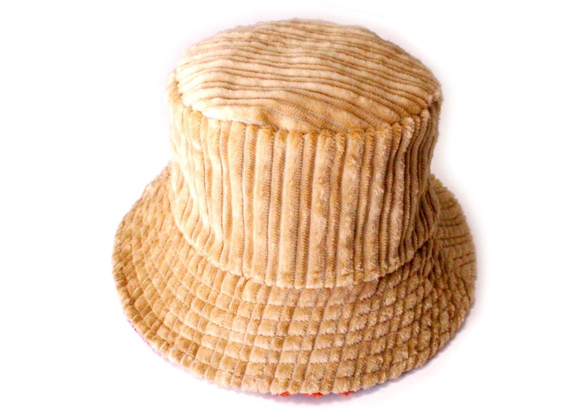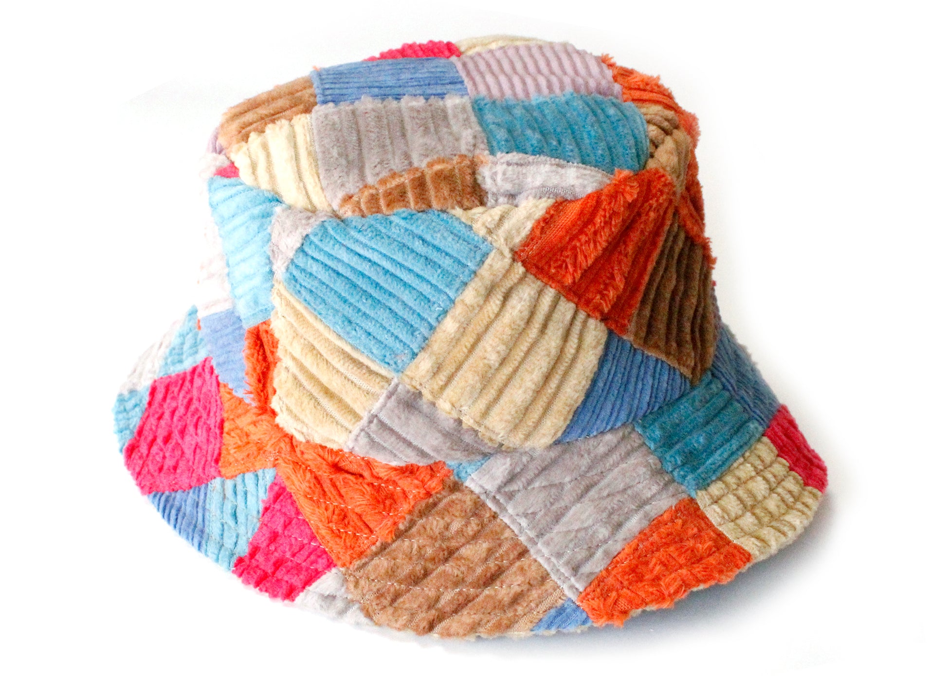 This super versatile & sustainable bucket hat is made to last, with one side made of patchwork cotton corduroy squares and the other side of solid tan corduroy.