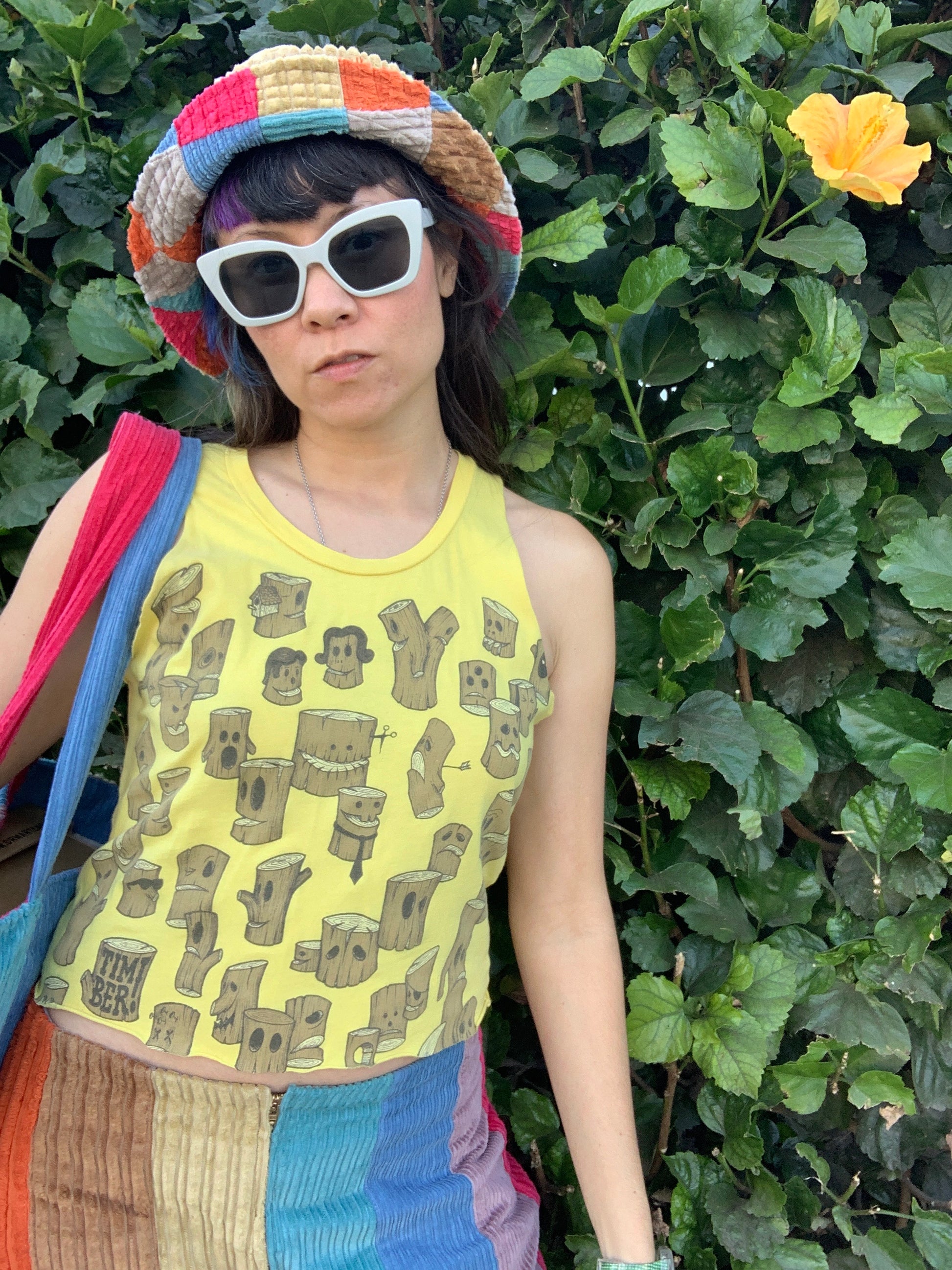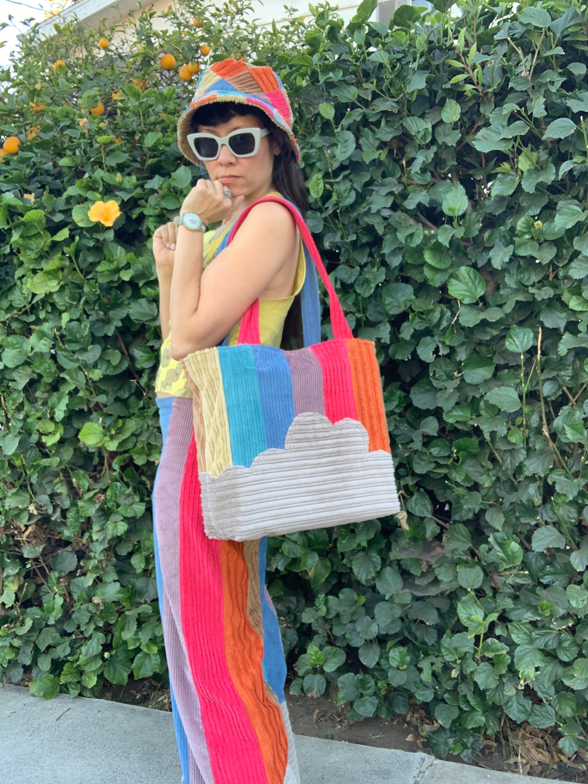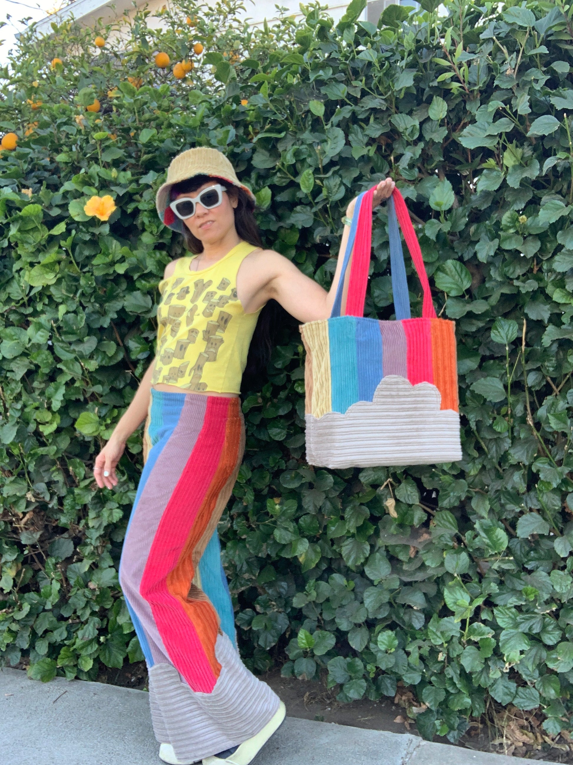 This super versatile & sustainable bucket hat is made to last, with one side made of patchwork cotton corduroy squares and the other side of solid tan corduroy.